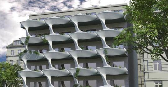 Die Leipziger Architekten Stefan Paulisch, Uta Kieffling und Pamela Voigt haben aus Carbonbeton eine sehr schwungvolle Fassade entwickelt. (Quelle: SGL Carbon)